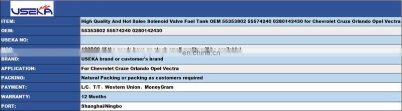Home > Products > For Chevrolet parts > High Quality And Hot Sales Solenoid Valve Fuel Tank OEM 55353802 55574240 0280142430 for Chevrolet Cruze Orlando Opel Vectra