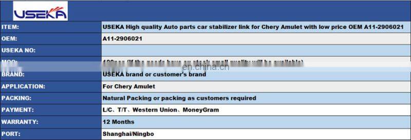 Home > Products > For Chevrolet parts > USEKA High Quality Auto Parts Car Stabilizer Link for Chery Amulet With Low Price OEM A11-2906021