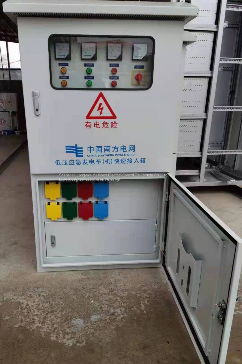 Shenzhen Long Yan intelligent electric control equipment co., LTD., specializing in the production and sales of power car emergency rapid access device, high and low voltage switchgear, transformer substation emergency power fast access box, 110 kv substation project quick plug, emergency power supply substation quick access device, emergency power supply substation fast plug unit, emergency generators coupled fast plug connector, power car access cable plug socket, quick reply message device, low voltage distribution network rapidly wired access unit device, using existing quick joint of electrical equipment and intelligent relay protection technology, research and development of a set of emergency power supply access device quickly, rapid emergency power supply access device is mainly used for emergency repair of disaster relief, large engineering can get promptly in the power supply, such as: hospital, high-rise office buildings, airports, satellite launch and control base, large stadium, archives and so on, of the more important scientific research building of power supply, mobile emergency power car temporary protection and security, they are widely used power supply interface standard for its southern netcom.