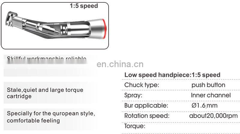 Home > Products > Dental Equipment > Low Speed 1:5 Increasing Push Button Fiber Optic Contra Angle Handpiece for Dental Chair