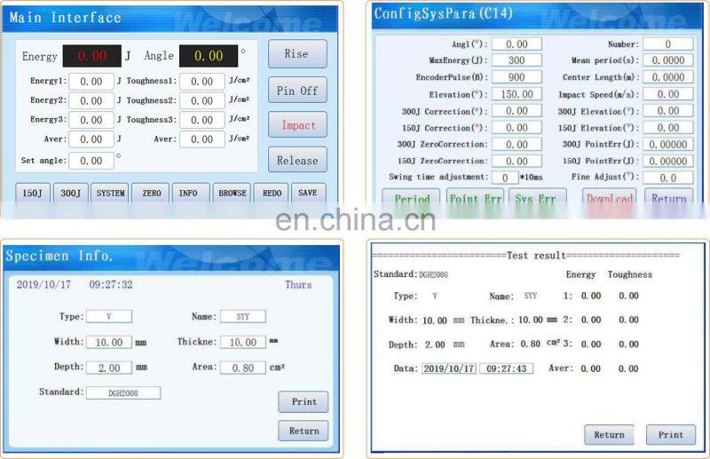 1. Microcomputer control, electric rising pendulum, impact, results are measured calculated by microcomputers and displayed digitally and printed out; having high operation efficiently, high testing accuracy. the energy which is remained after the specimen is impacted broken can automatically rise the pendulum for the next testing, simple operate and has high working efficient, the materials impact absorbed energy, impact elasticity and pre-rising angle of pendulum and average value of test can be calculated and displayed, The test data and average value of the time can be printed