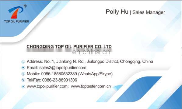 Chongqing TOP Oil Purifier Co.,Ltd, established in 2 0 1 2 , is a professional manufacturer engaged in the research, development, production, sale and service of oil purifiers and various related testers.We are located in Chongqing China - a southwest electromechanical manufacturing center as well as national municipality, which is one of the most well-known oil purifier manufacturers in southwest China. Dedicated to strict quality control and thoughtful customer service, our experienced staff are always available to discuss your requirements and ensure full customer satisfaction. On basis of mature development and manufacture technology and highly qualified production management team, the products own high quality, easy operation, excellent performance and long service life. In addition, Our company has won C E,S G S certificates. Selling well in all cities and provinces around China, our products are also exported to clients in such countries and regions as Australia, Canada, USA, South Africa , Asia etc.. Our company holds the managerial idea that “ Honest treatment,Sincere Communication,Reliable Quality and Service Commitment”, and tries its best to do well at any aspect from each part, each point of procedure of manufacturing to final inspection, packing and shipment. We also welcome O E M and O D M orders. Whether selecting a current product from our catalog or seeking engineering assistance for your application, you can talk to our customer service center about your sourcing requirements.