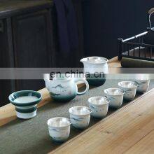 Pure Silver Kung Fu Tea Set, Blue and White Porcelain Set of Ceramic Teapot