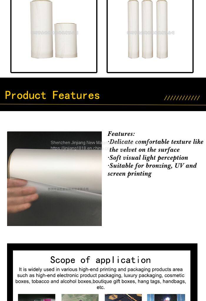 Velvet Soft Touch Lamination Film is one kind of the BOPP matt lamination film with velvet soft touch feeling. The surface has a soft visual light perception and a smooth, delicate comfortable velvet touch texture.