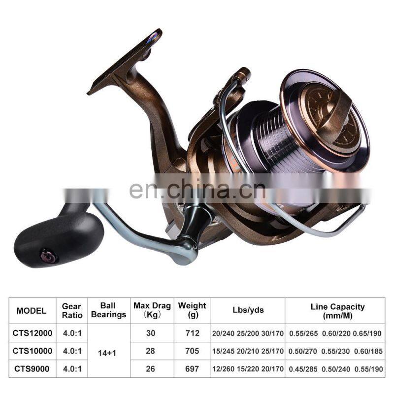 Home > Products > Fishing Reel > Powerful Heavy 9000/10000/12000 Full Metal High Speed 14+1BB MAX DRAG 30KG Sea Fishing Spinning Fishing Reel