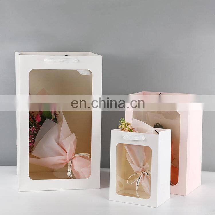 Custom Pink Square Bottom Gift Paper Flower Bag Wide Base For Flower Box