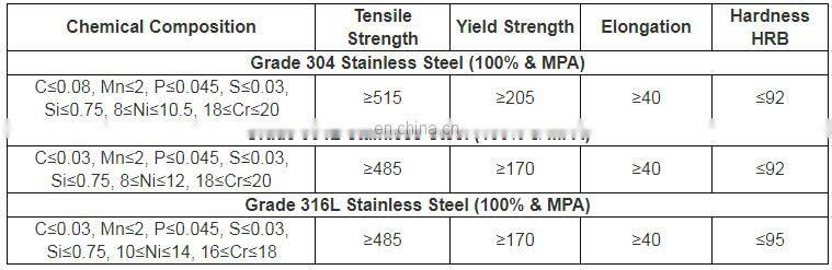 Material | 201/202/301/302/304/304L/316/316L/309S/310S/321/409/410/420/430/430A/434/444/2205/904L |
