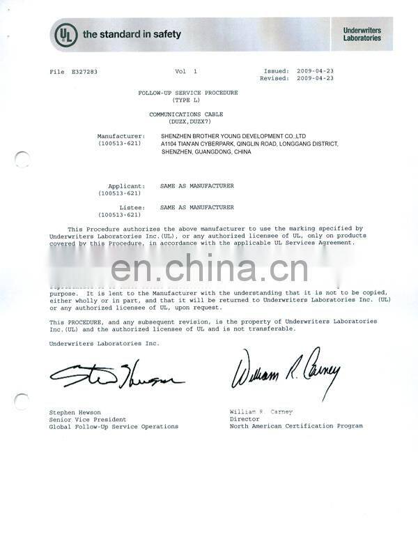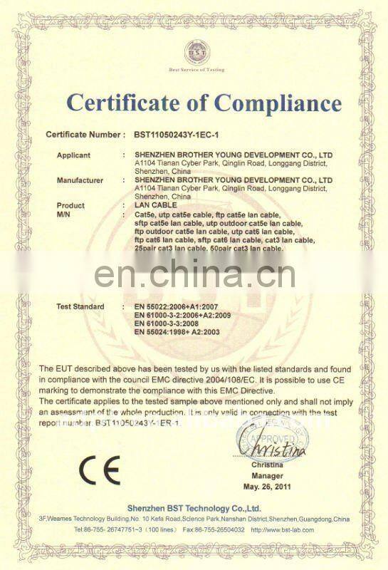 Founded in 2002,Shenzhen Brother Young Development Co., Ltd. enjoys a history of 19 years' development .After 19 years of constant effort and persistence, it has developed into a modern high-tech enterprise.Our main products include CAT5E and CAT6 computer cable, patch cord cable,large number pairs cable, telephone cable, USB cable, fiber optic cable, fiber optic patch cord,and other relative network accessories.We own two factories in Jiexi, and Tongle Park, Longgang District,Shenzhen,Guangdong Province.The factories cover an area of nearly 150,000 square meters.