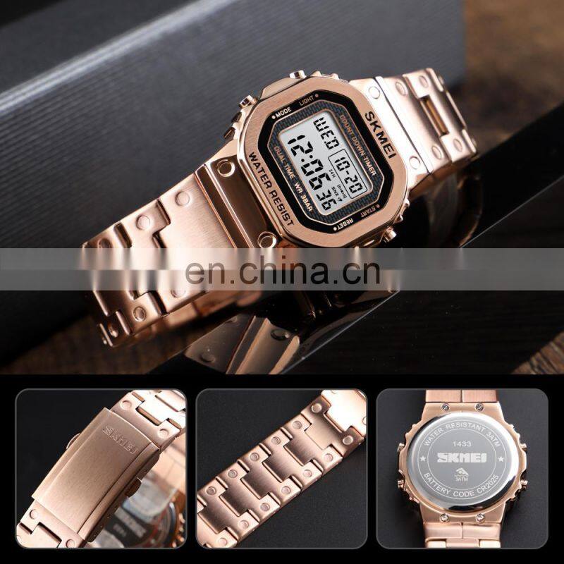 SKMEI 1433 Unique Rose Gold Lady Digital Watch Nice Stainless Steel Band Waterproof Calendar Vintage Casual Wrist Watch