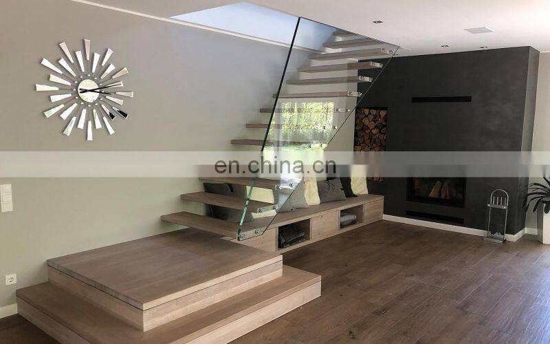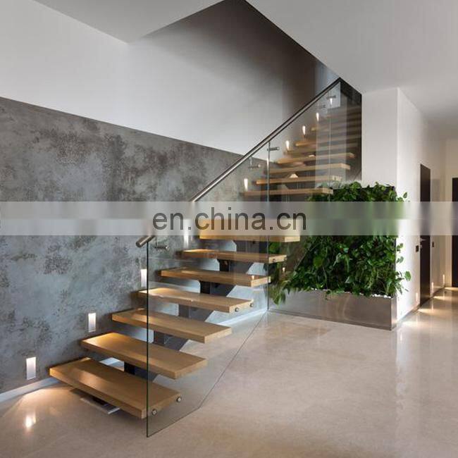 Solid Oak Beach Wood Steps Mono Beam Straight Stairs Single Stringer Staircases With Standoff Glass Railings