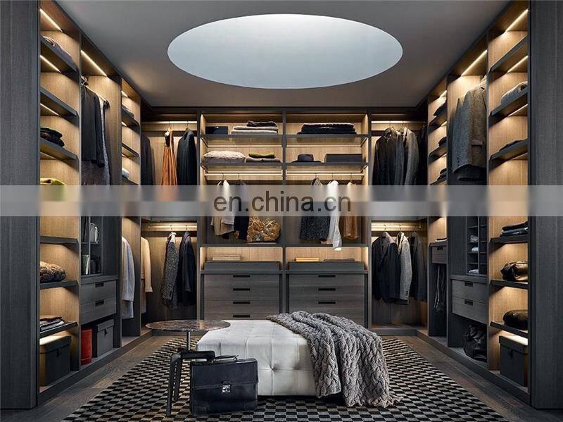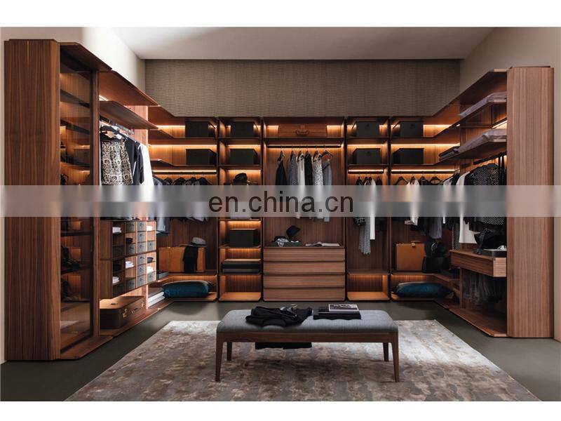 Luxury Custom Bedroom u Shaped Walnut Wood Walk in Closet With LED Lighting