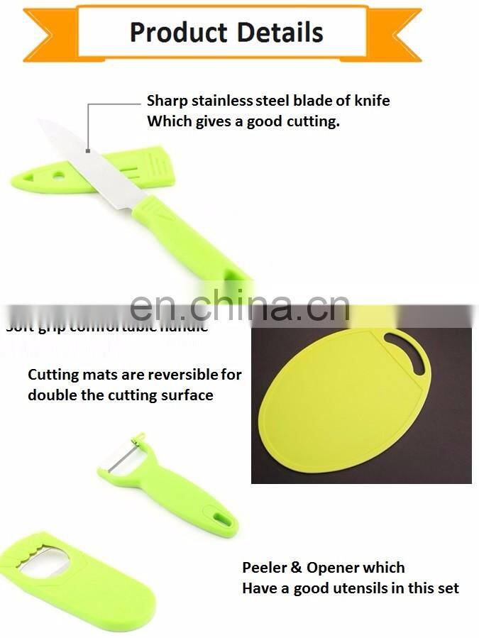 Size and Weight | Knife size - 10 x 2 x 0.1 cm ( L x W x THK), 35 g Opener Size - 9.5 x 4 cm, 17g Peeler Size - 15 cm, 28 g Scissor Size - 21 cm, 66 g Board Size - 30 x 21 cm, 160 g |