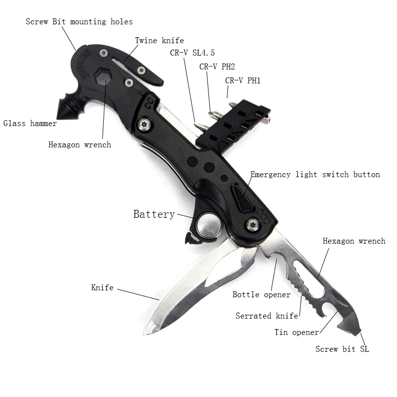 Pocket Size Stainless Steel Car Emergency Safe Glass Multi Hammer Bottle Opener Knife Screwdriver