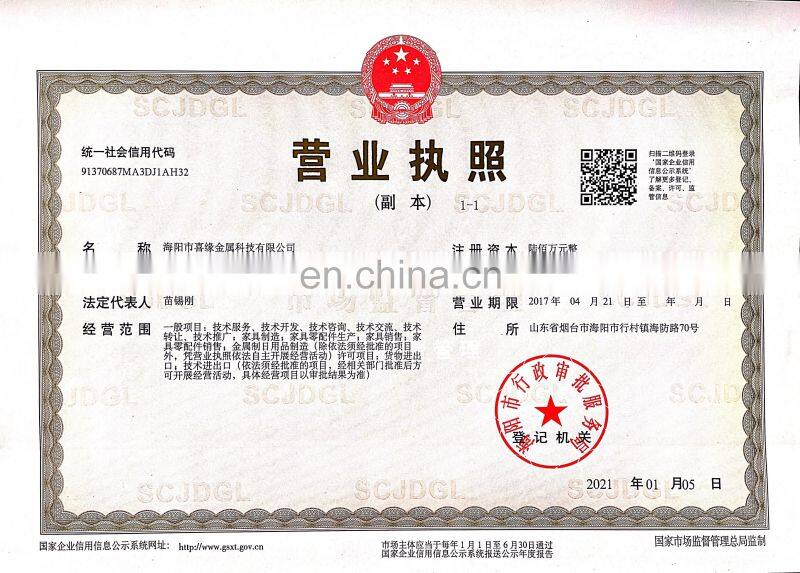 Haiyang Xiyuan Metal and Technology Co, Ltd is a professional manufacturer of metal and wood furniture. Factory founded in 2007 in Qingdao, and moved to Haiyang Yantai, Shandong province, in 2017, is a collection of product development, production, sales and service in one of the professional furniture manufacturing company. It has do BSCI factory inspection.