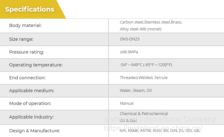 MstnLand's series of Forged Needle Valve is one-piece forged body and two type of valve stem, on the valve stem threads by the special hardening treatment, the stem by the rolling surface hardening treatment, the stem threads of grease and system dielectric isolation, non-rotating stem under the above motion instead of rotating lifting, reduce the friction each trip to packing, reduce the friction between the valve seat and valve head, handle the locking screw on both ends, solid and durable.
