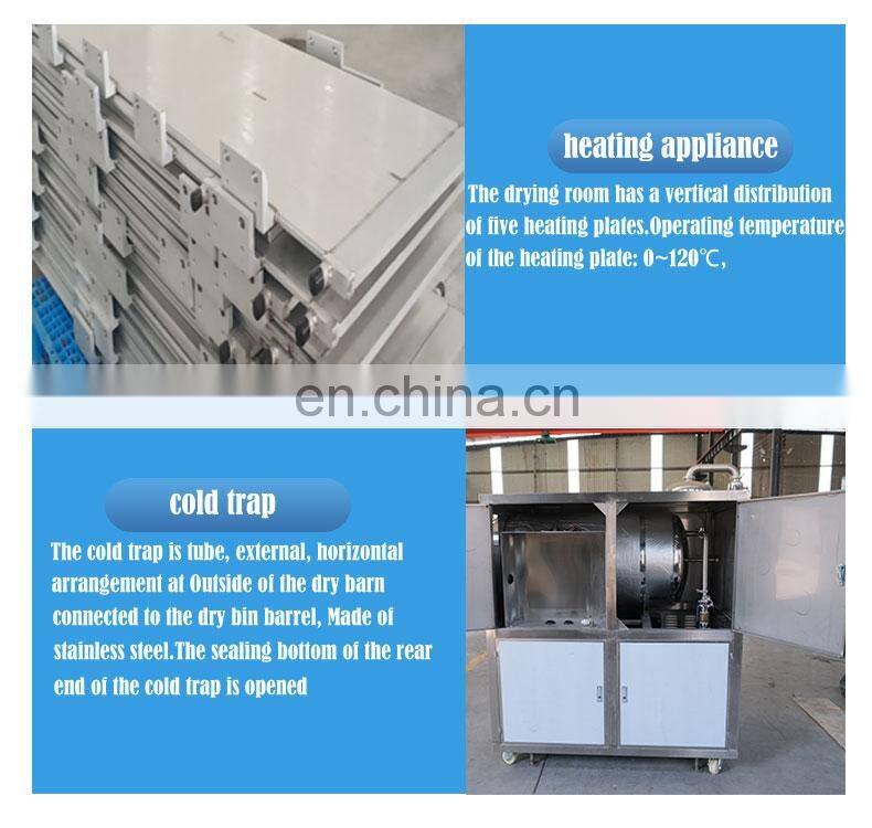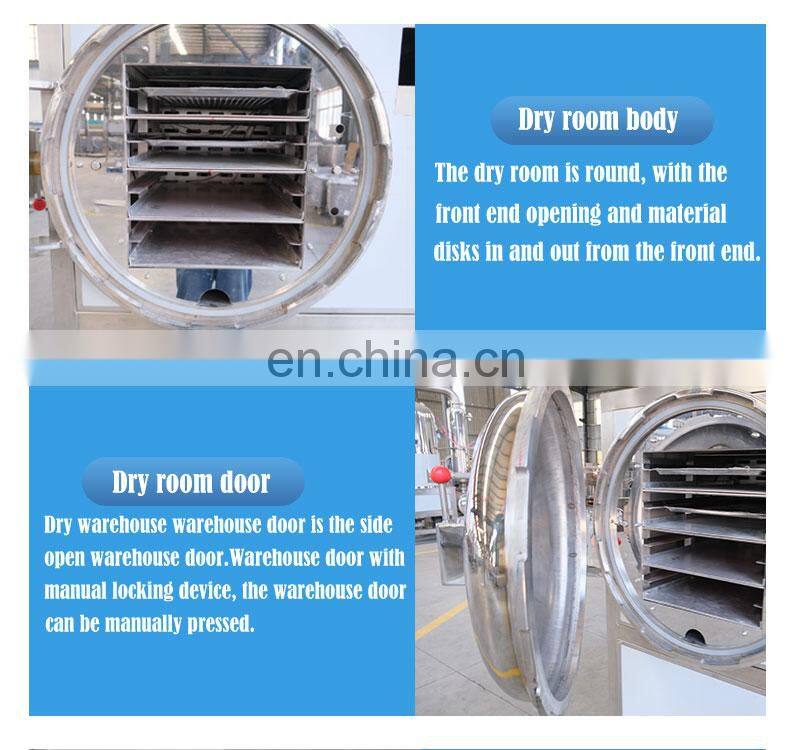 3. High degree of automation, refrigeration, heating, vacuum, pneumatic, all automatic control. Cream useManual control. The cooling water system is operated manually, with automatic display and alarm function. Freeze-dried warehouse For a heating plate as a spare