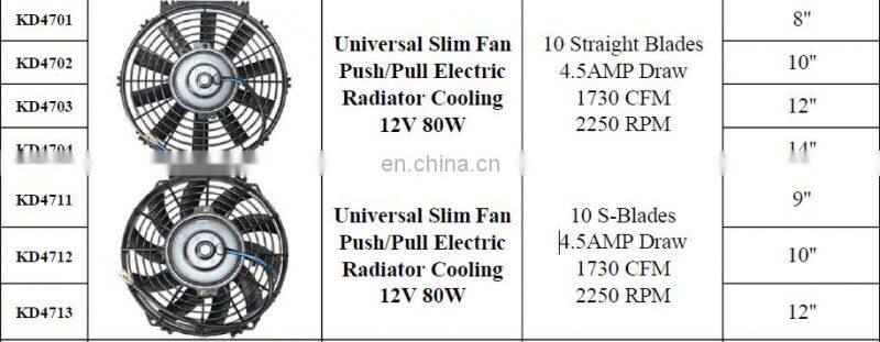 Universal 10 Straight Blades 4.5AMP Draw 8'' 10'' 12'' 14'' Push/Pull Electric Car Radiator Cooling Slim Fan 12V 80W