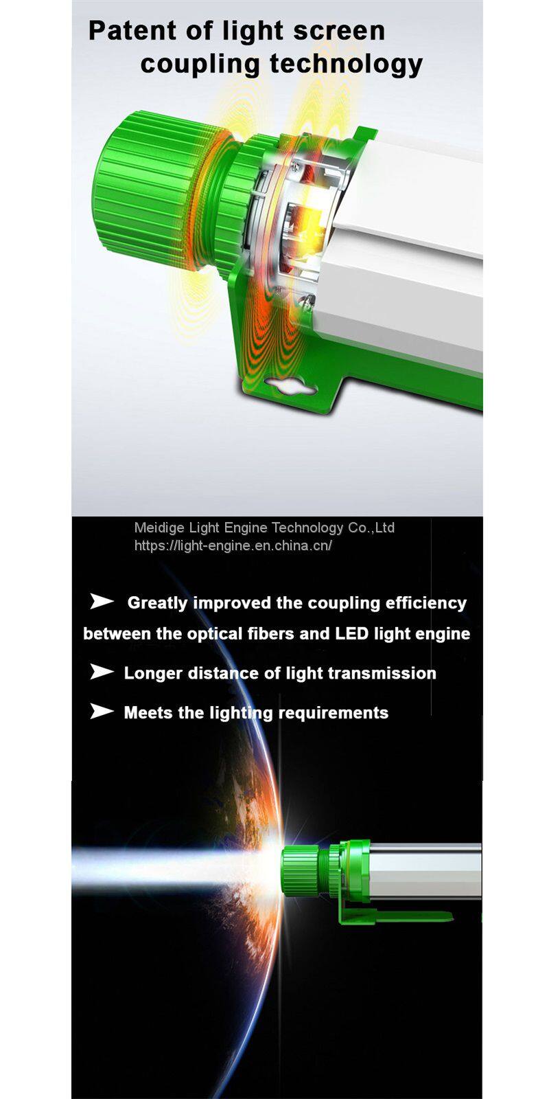 Applied in optical fiber conduction of lighting, our independent R & D of light screen coupling system, for the first time meets the requirements of lighting level at the end of conduction of lighting, which achieves the middle and far distance efficient optical fiber transmission of visible light and enables safe and healthy lighting.