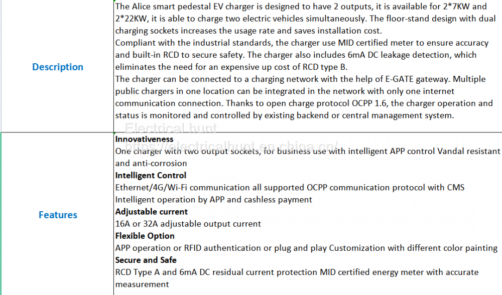 The Alice smart pedestal EV charger is designed to have 2 outputs, it is available for 2*7KW and 2*22KW, it is able to charge two electric vehicles simultaneously. The floor-stand design with dual charging sockets increases the usage rate and saves installation cost.