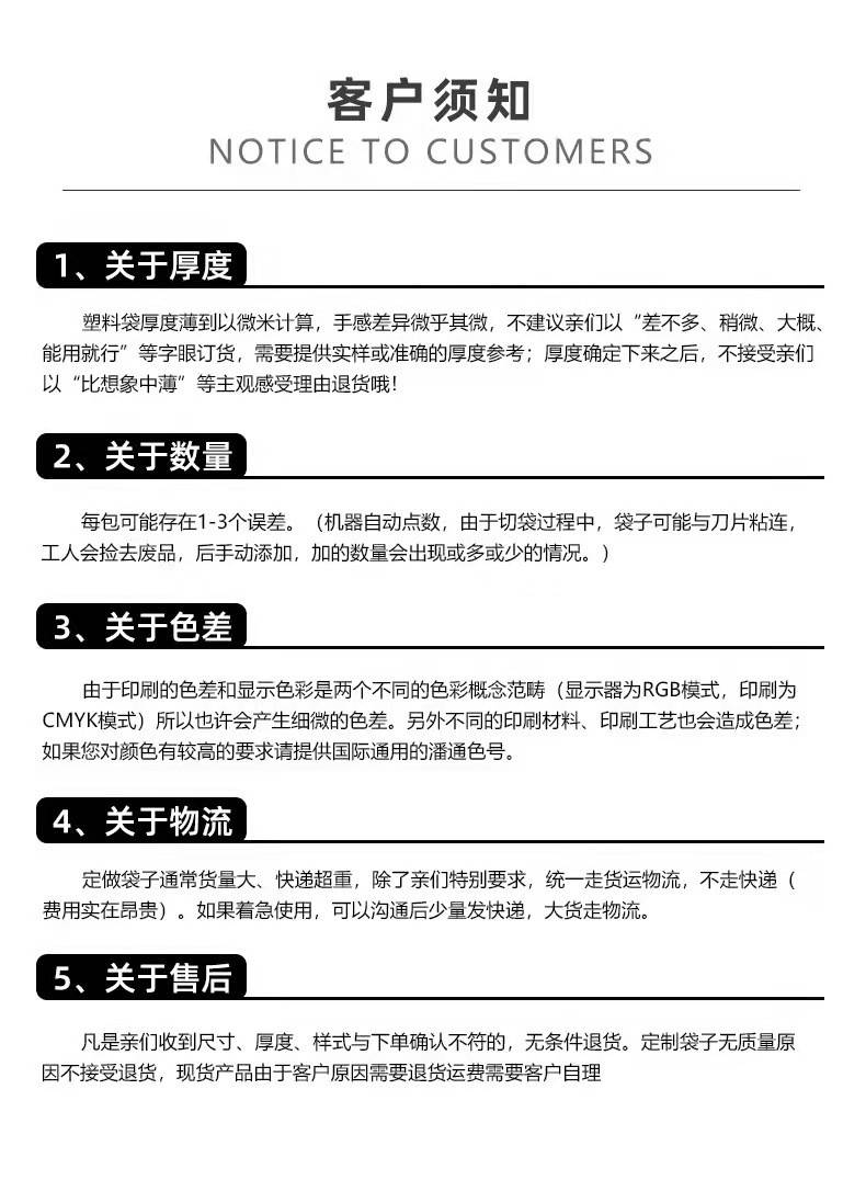 About delivery;The actual finished product of the bag will have a 2mm float, and the payment will be settled by the actual production quantity. Please inform us in advance if you have strict requirements on the quantity.Please check carefully after receiving the goods, if you have any questions, contact customer service at any time.At your s product display