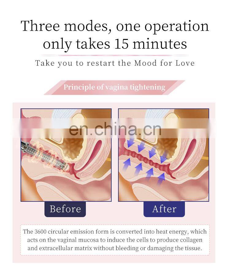 Vaginal tightening laser is the use of water uptake 10600nm gold standard laser, using a three-dimensional lattice technology and 360-degree circular emission perfect combination of technology, to produce 50-70 degrees Celsius in a controlled depth of the vaginal mucosa, stimulate lamina propria and myometrium newborn fibroblasts, and damaged collagen fibers, elastic fibers, such as restructuring, so as to achieve vaginal wall thickening and tighteningof the vagina so that firmness, sensitivity enhancement, vagina tight as ever.