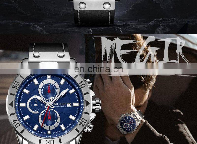 MEGIR 2081 Men's Quartz Sport Watch Leather Strap With Date Display Fitness Chronograph Watch