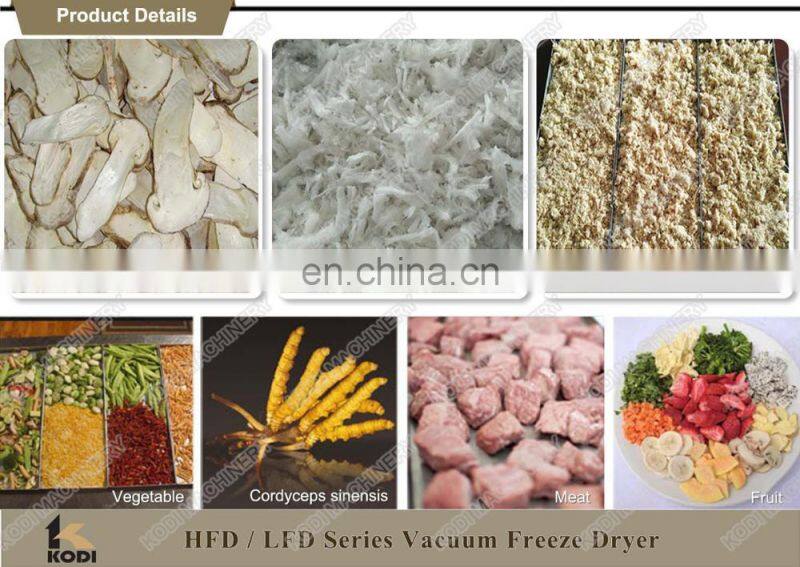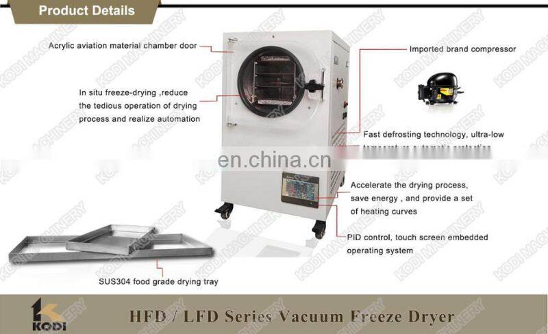 The major parts of KODI small vacuum freeze dryer price are imported from other countries, characterized by stability and reliability and many other advantages, such as good-looking appearance, small volume, light weight and easy operation. They can be widely applied to many fields, such as foods, biological products, chemical engineering, traditional Chinese medicinal materials and health care products. Because the drying process is carried out at low temperature, it can be used for some materials such as proteins, which are easy to be denatured at high temperature, and can ensure that the properties of other compounds will not change.