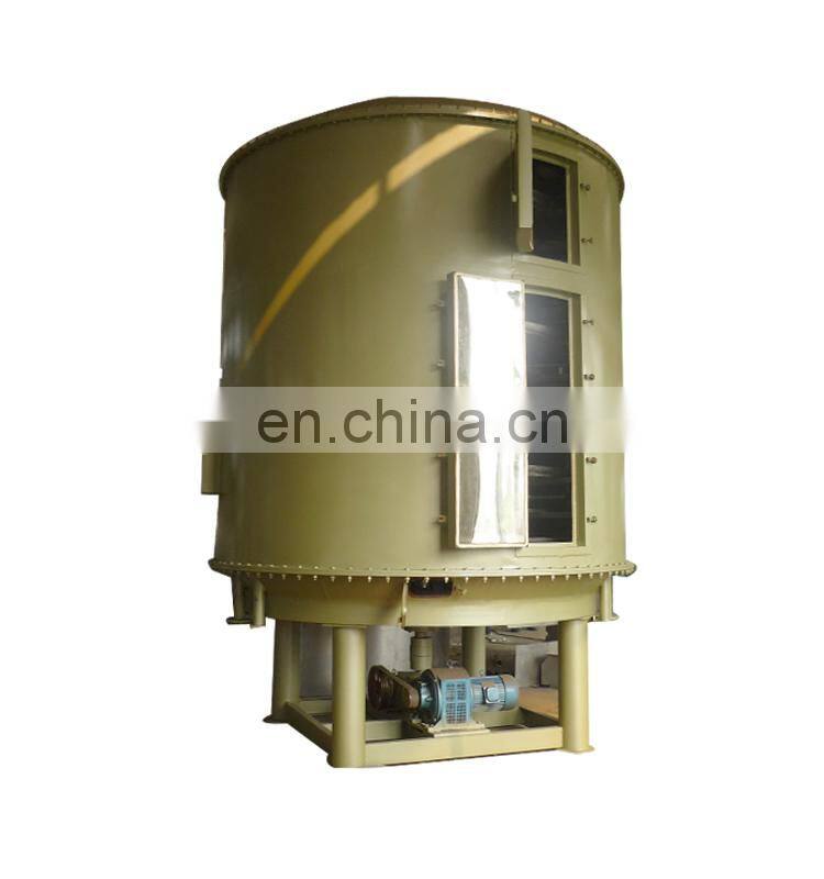 Wet materials are fed continuously to the top drying layer in the dryer. They will be turned and stirred continuously by harrows when the harrow's arm rotates, the material flows through the surface of the drying plate along the exponential helical line. On the small drying plate the material will be moved to its exterior edge and drop down to the exterior edge of the large drying plate underneath, and will then be moved inward and drop down from its central hole to the small drying plate on the next layer. Both small and large drying plates are arranged alternately so as materials can go through the whole dryer continuously. The heating media, which could be saturated steam, hot water or thermal oil will be led into hollow drying plates from one end to other end of the dryer. The dried product will drop from the last layer of the drying plate to the bottom layer of the smell body,