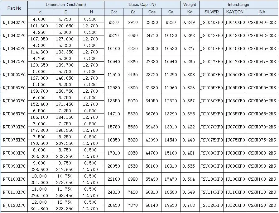 JU075XP0 Thin section four point contact sealed ball bearing belongs to JU SERIES of thin section sealed ball bearings, the JUSERIES include JUCP0 and JUXP0,which represented : Type-C : Deep Groove bearing and Type-X: Four Point Contact bearing the rolling body of these bearings is a ball, which can be nylon ball or steel ball as requested. The Cross Section is constant, that is 1/2 inch. The ID of JU075XP0 is 7.5 Inch ( 190.5 mm).