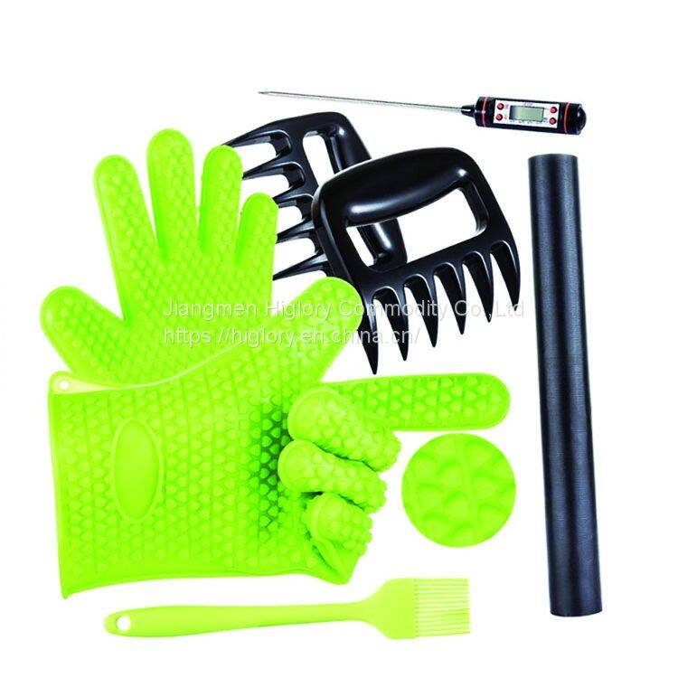 | Size | Glove: 27x19cm Brush: 20.5x3.5cm Meat divider: 11x2.5cm Barbecue tong:9/12" Grill mat:15.7x13",thickness:0.2mm  |