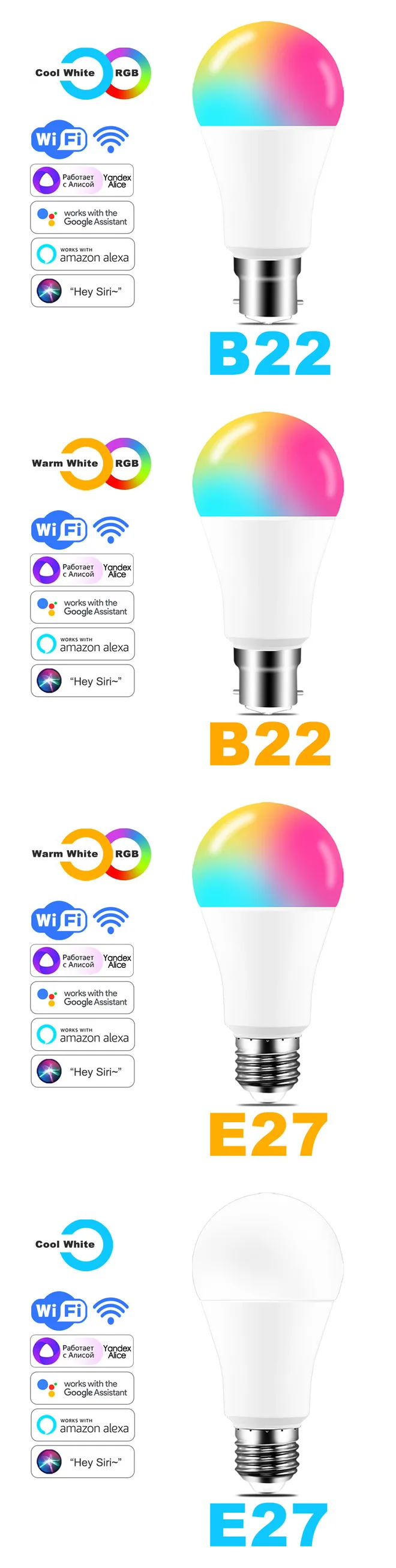 RGB Lamp RGB+White WiFi Smart Light Bulb E27 B22 LED Lamp 10W Compatible Smart Light Bulbs