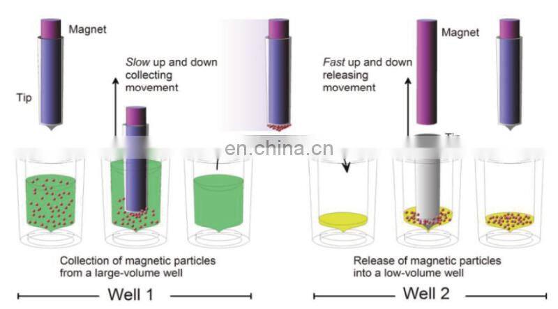 This Automatic nucleic acid extractor adopts magnetic beads separation technique. Different from the magnetic beads purifying method of other movable liquid, the magnetic beads are transferred between deep well plate with specific reagent under this method, the magnetic rod is loaded with disposable magnetic sleeve, through the separation of magnetic rod and the magnetic sleeve, the collection, release, transfer and incubation is realized. The high quality nucleic acid can be extracted from specimen like saliva, swab, dry blood stain, complete blood, serum/plasm, animal and plan tissue.