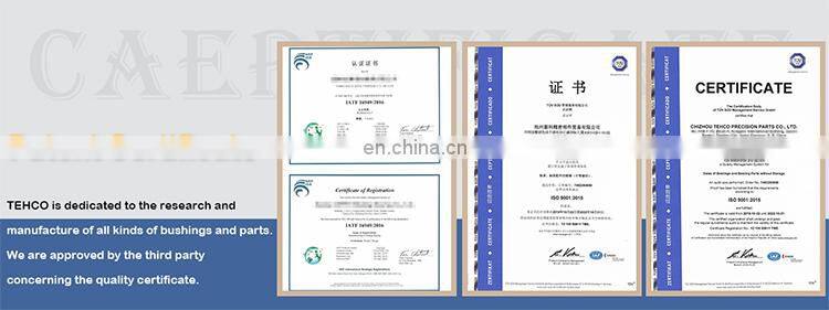 TEHCO is dedicated to the research and manufacture of all kinds of sliding bearings. We are approved by the third party concerning the quality certificate. Our core management team has more than 20 years experience in production and development of bushings. Up to now, we have developed a total of ten categories of products, including composite self-lubricating bushing, boundary lubricating bushing, bimetal bushing, oil sintered bushing, solid lubricating bushing with graphite, steel bushing, casting copper bushing, wrapped bronze bushing, spherical plain bearing and filament wound bearing. The quality and performance have met or exceed international standards. We have complete in-house research and development, production, testing and marketing capabilities.