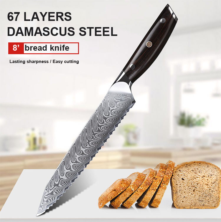 8 Inch Bread Knife Damascus Stainless Steel Professional Grade Bread Kitchen Knife Serrated Edge Cake Crusty Bread Knife