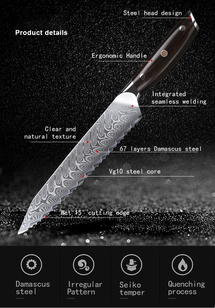 Home > Products > Kitchen knife > Kitchen Bread Knife Serrated Design Damascus Stainless Steel Blade 8 Inch Chef Knives Bread Cheese Cake Tool