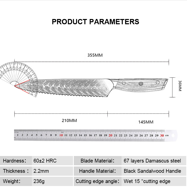 8 Inch Bread Knife VG10 Damascus Steel Wide Wavy Edge NSF Certified Bread Knife With Black Sandalwood Handle Kitchen Knives