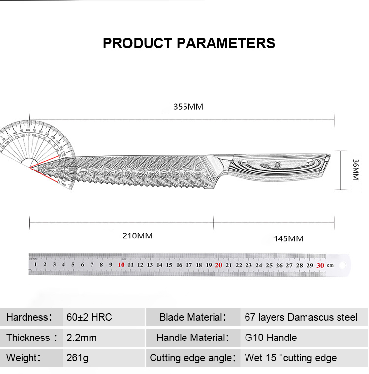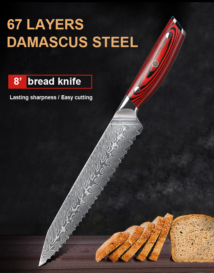 8 Inch Bread Knife Damascus Stainless Steel Professional Grade Bread Kitchen Knife Serrated Edge Cake Crusty Bread Knife