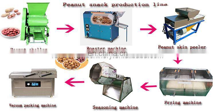 Raw material(peanuts) -- Continuous frying-- Removing oil from fried peanuts -- Cooling the fried peanuts -- Seasoning