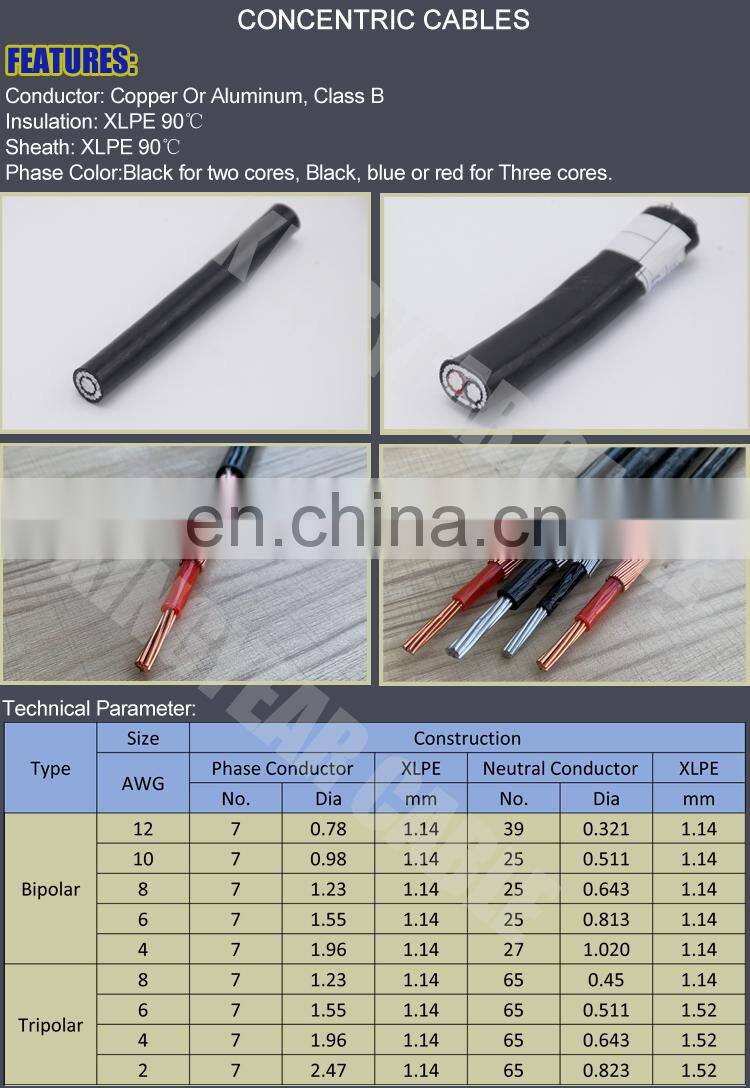 Concentrico Cobre 2x8 Awg 2x10 3x6 3x8 AWG XLPE Insulated Concentric Aluminum Copper Cable