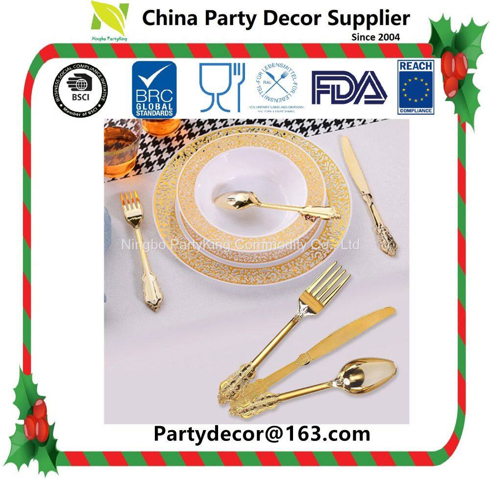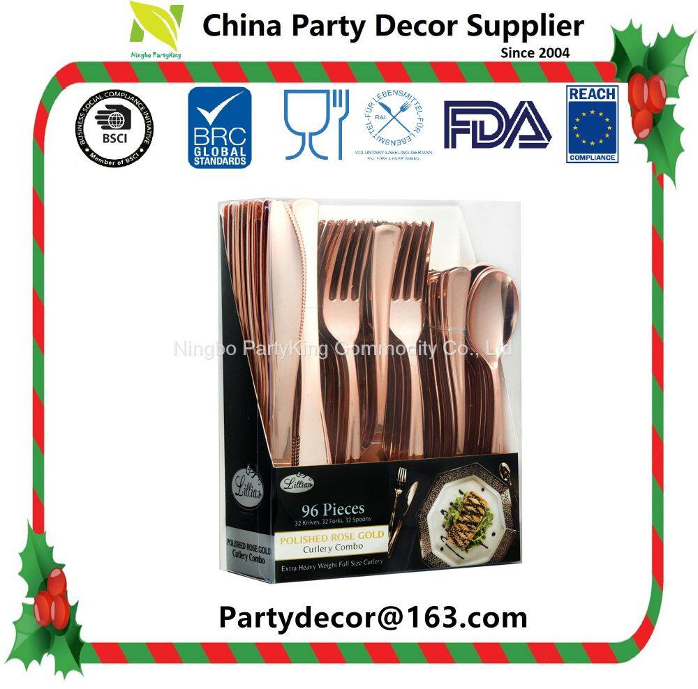 | Name | Food Safe Rose Gold Silver Coated Disposable Dinnerware Plastic Cutlery Tableware Set Party Table Decoration Plastic Cups Plate Forks Knives Spoons Napkins |
