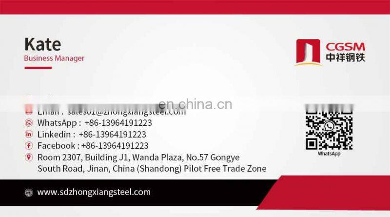 Shandong Zhongxiang Steel Group Co.,Ltd.We are a professional manufacturer engaged in the research, development, production, sale and service. Our main products include PPGI ,galvanized steel, steel plate , round bar, steel pipe ,Stainless steel product ,angle bar, steel pile ,H beam ,I beam, angle, Channel flat steel etc . Main market distributes in North America, South America, Africa, Southeast Asia as well as Oceania. Up to now, we have established long-term and win-win partnership with many large steel manufacturers, such as Baosteel, Laiwu Steel, Rizhao Steel,Handan Iron and Steel, Angang and Maanshan Iron and Steel. We sincerely wish to build a long and regular business with you forever.