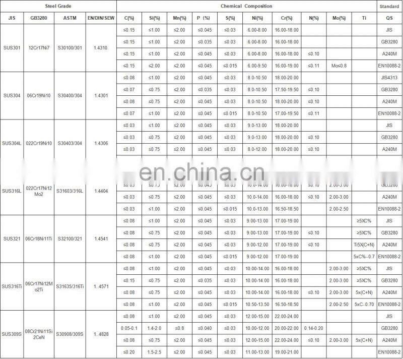 Steel Grade | 301L, 301, 304N, 410, 316L, 316, 321, 304, 439, 436, 304L, 405, 370, 429Etc |