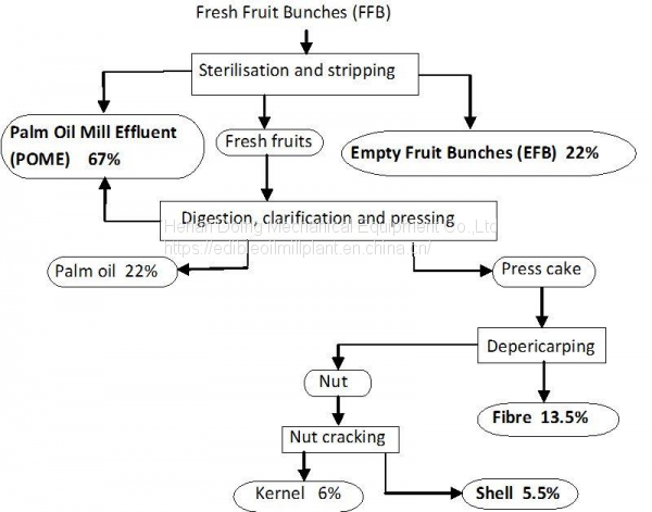 Raw material reception--Sterilization--Threshing—Digesting & pressing--Oil clarification--Kernel recovery