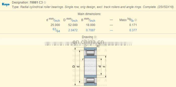25x52x18mm Original Koyo Bearing 70081C3 Cylindrical Roller Bearing 70081