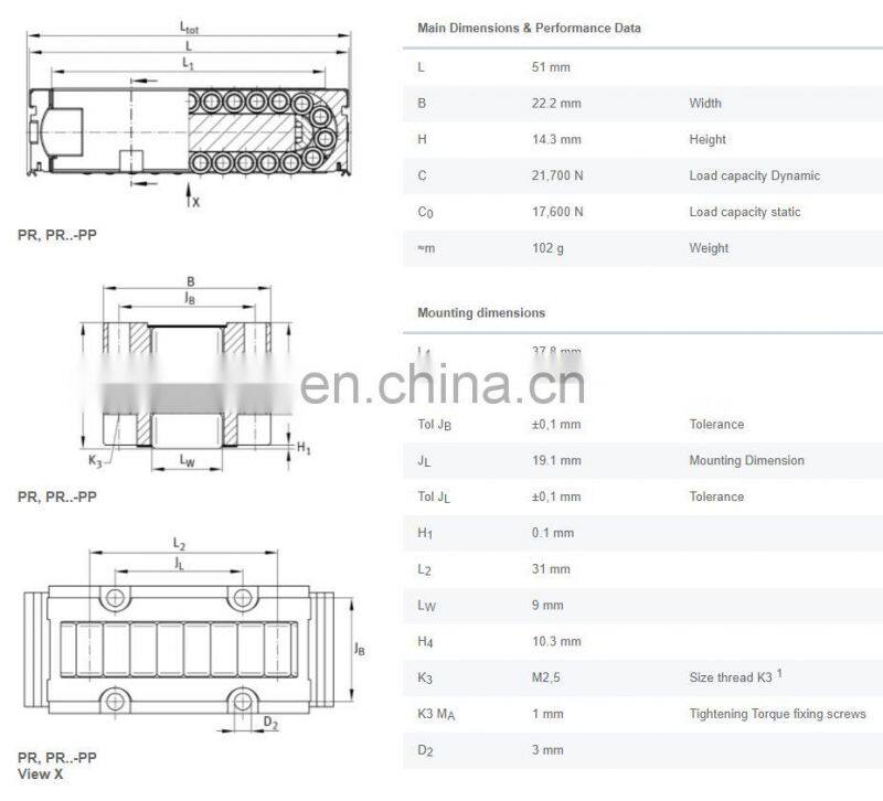 inch size :PR14032 GR1、PR14044 GR1、PR14061 GR1、PR14089 GR1、PR14135 GR1、PR14182 GR1 with spacer elements, with end face lubrication connectors The data sheet is only an overview of dimensions and basic load ratings of he selected product. Please always observe all the guidelines in these overview pages. Further information is given on many products under the menu item “Description". You can also order comprehensive information via the Catalogue ordering system