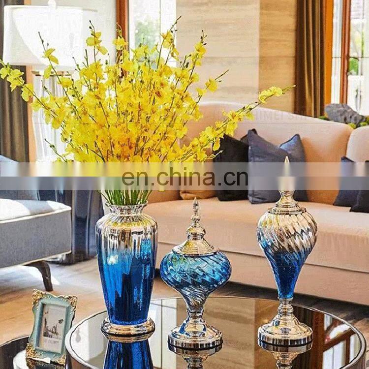 Home Decorative Craft Gold Lid Blue Ceramic Porcelain Vase
