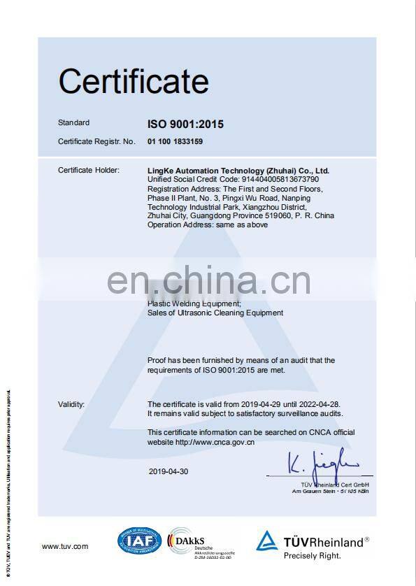 Originated in 1993, Lingke has been committed to R&D and production of high performance ultrasonic plastic welding equipment, with more than 20 years’ expertise in ultrasonic technology. The main brands are "LINGGAO" "LINGKE"and "SHENGFENG" etc.. They are widely used in plastics, non-woven fabrics, packaging, printing consumables, medical, electronic appliances, automobiles and other fields, providing a large number of cost-effective ultrasonic welding equipment and application solutions with high quality and strong stability for various industries at home and abroad.