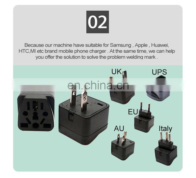 Usually for those USB wall and mobile phone adaptor , they will use 15KHz ultrasonic machine ,but it's easy to broken the inside PCB parts ,some of them use the 20KHz ultrasonic welding machine, but it's not stable and can't reach waterproof funtion . Those machine are cheaper , but low production capacity and waste material and time . Our digital type ultrasonic welding machine can help you solve those problem .It's worth you to take some time to read and contact with us . Because our machine have suitable for Samsung , Apple , Huawei, HTC,MI etc brand mobile phone charger . At the same time, we can help you offer the solution to solve the problem welding mark .