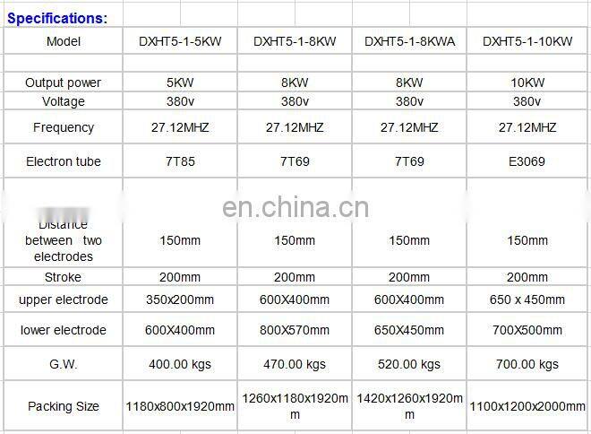 Our company focuses on the research and development of high frequency machine, high frequency plastic welding machine automation equipment production and sales, for the geothermal heating industry design automatic geothermal film welding machine; Develop automatic high-frequency heat sealing machine for disposable medical bag automatic production line; For the automotive interior industry research and development of automotive soft door heat sealing machine/solder pad/solder visor welding machine/curtain heat sealing machine and other interior decoration welding equipment; To provide customers with better automation solutions; Standard type heat sealing machine is mainly suitable for processing PVC, TPU, EVA or mixed materials containing 20%PVC, like PVC rubber boots,water pants, leather embossing, luggage, electric car mat, three-dimensional packaging bags, blister shell,hot water bag, medical supplies, stationery supplies, oxygen bags etc. Custom type is mainly used for PVC carpet, lifejackets,lifebuoys,ice mat,yoya mat,non-slip blocks,car mats PVC Tarpaulin,canvas,tarpaulin,Car tarpaulin etc, etc Plastic products welding.