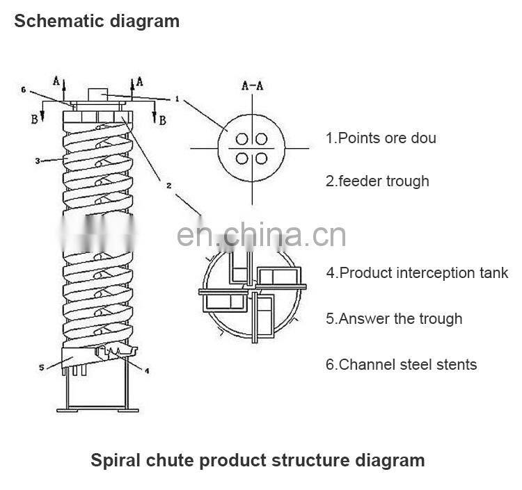 The spiral chute is used for gold ores,silver ores, placer mines,lead zinc ores, copper ores, tin ores, ilmenite, pyrite,hematite, limonite, chromite, ferberite, tungsten ores. tantalite ores, coal ores, monazite, Sapphire barite, futile, zircon,and silica sands. The sprial chute is the ideal equipment for gravity selecting for the ferrous & non ferrous metal, non-metallic ores and rare earth ores.